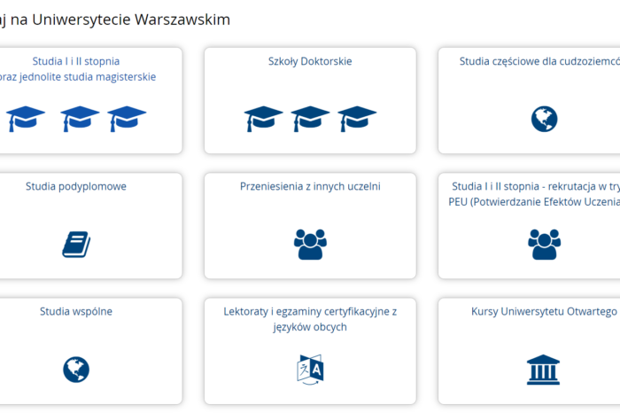 Obsługa studenta 23.10.2023 Aktywowanie hasła CUS za pomocą kodu Co zrobić gdy student zapomni hasła do USOSweb? 12.09.2023 Dni adaptacyjne w roku akademickim 2023/2024 Kilka przydatnych informacji do tworzenia programu dni adaptacyjnych. Zobacz więcej Obsługa toku studiów 31.10.2023 Antyplagiat w pigułce – JSA czy API Zachęcamy do lektury nowej instrukcji dotyczącej obsługi JSA. 14.09.2023 Ślubowanie vs POL-on Ważne! Osoby bez zaakceptowanego ślubowania nie zostaną zaraportowane do POL-on. Zobacz więcej Rekrutacja 24.10.2023 Studia II stopnia – rekrutacja na semestr letni 2023/2024 Na stronie irk.uw.edu.pl jest już dostępna oferta studiów II stopnia dostępnych w rekrutacji na semestr letni RA 2023/2024. 24.10.2023 Zakończenie rekrutacji na RA 2023/2024 Rekrutacja na RA 2023/2024 została zakończona. Zobacz więcej